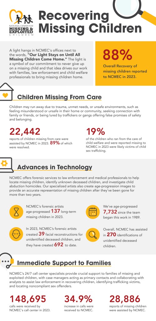 Recovering Missing Children infographic was designed using Adobe Illustrator. Elements such as hierarchy, layout, typography, color, icons, and illustrations were used.