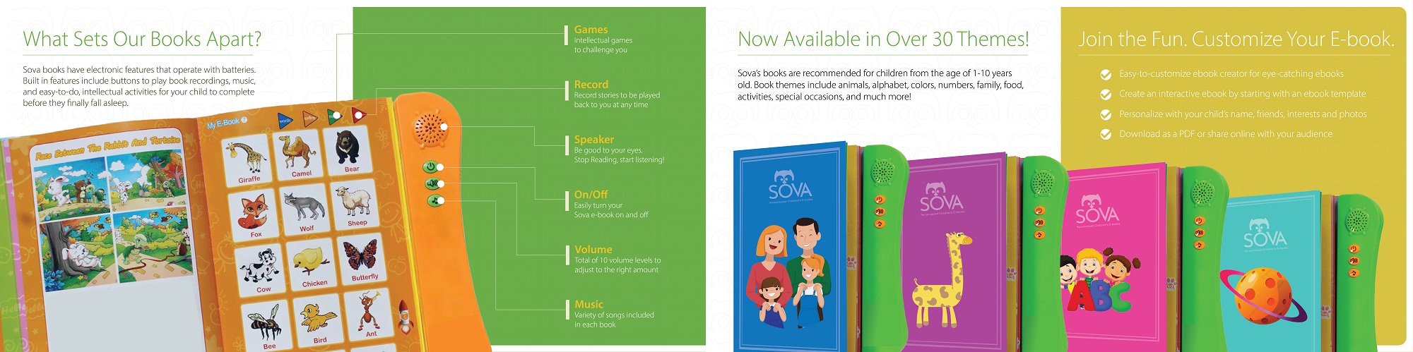 A 4-page brochure includes the mission statement, what sets Sova books part from its’ competitors, what can be found inside Sova books, available book themes to purchase, and contact information.