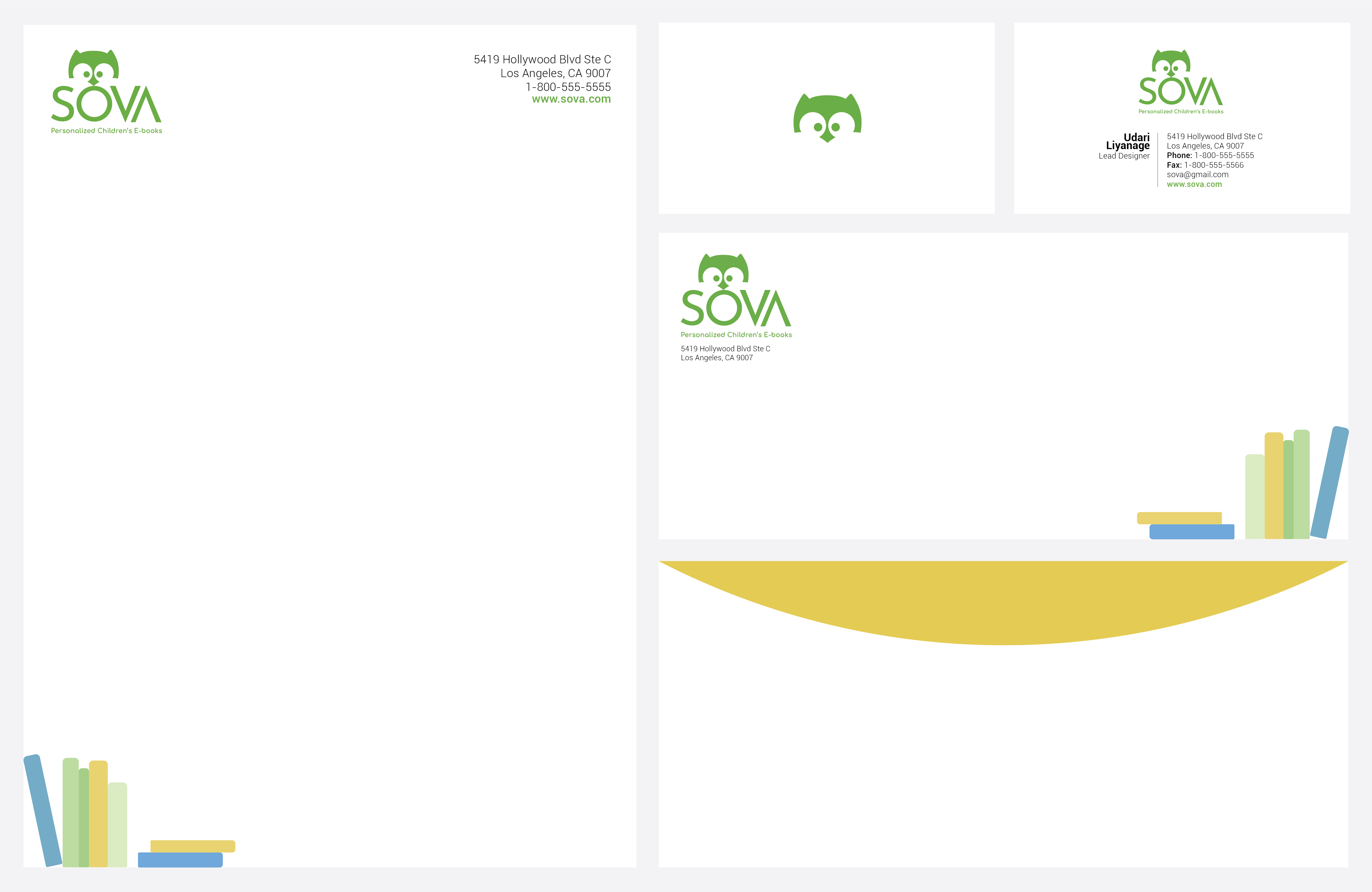 Left: Sova letterhead, business card (front and back), and envelope (front and back) Top right: Sova logo, Sova colors include yellow, green, blue and gray. Bottom right: Sova electronic book and matching colorful bookmarks.